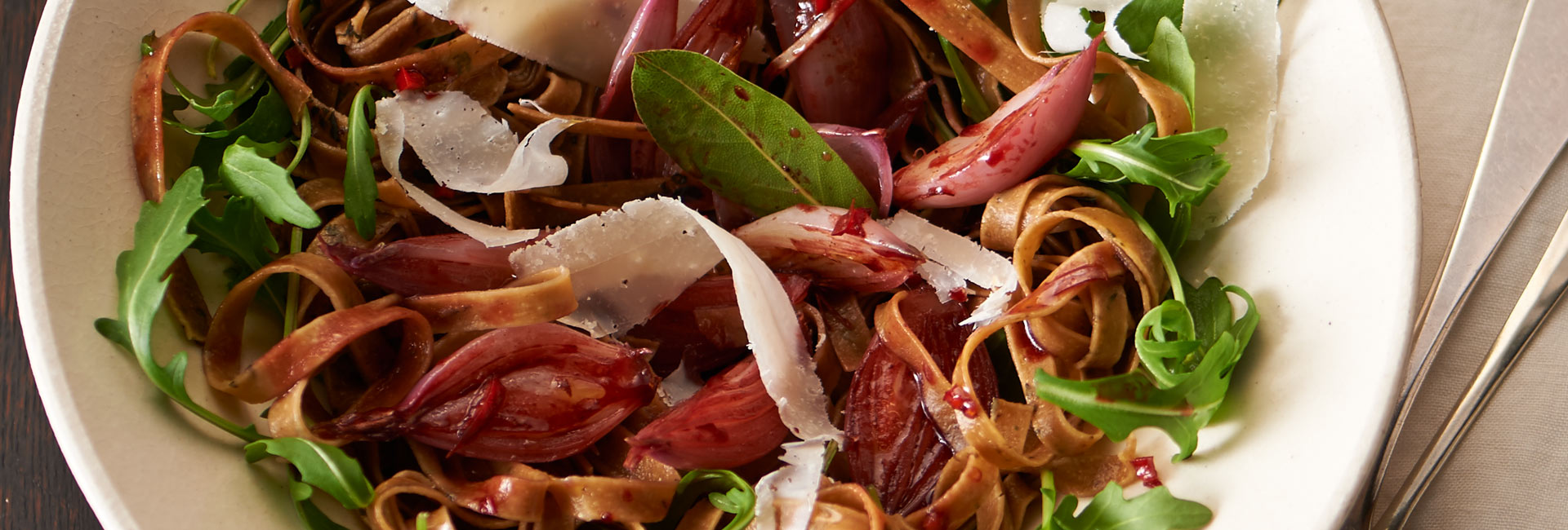 Rezept für hausgemachte Bandnudeln mit Portweinschalotten