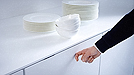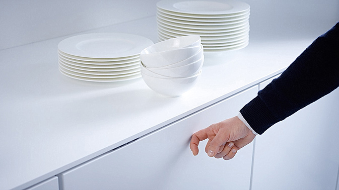 Durch zweimaliges Klopfen an die Gerätefront öffnet sich die Tür des Miele-Geschirrspülers, der komplett hinter der grifflosen Küchenmöbelfront verborgen ist. Automatisch schiebt sich die Tür auf und kann dann durch Ziehen geöffnet werden. Dabei reagiert das Gerät ausschliesslich auf Klopfen an die Gerätetür. Es öffnet sich nicht ungewollt, denn das System differenziert, ob Geräusche von der Tür, der Arbeitsplatte oder den benachbarten Schränken kommen. So fügen sich die neuen Geschirrspüler von Miele auch in grifflose Küchenfronten harmonisch ein, denn ein Türgriff ist nicht mehr erforderlich – und die Gerätefront bleibt frei von Fingerabdrücken.