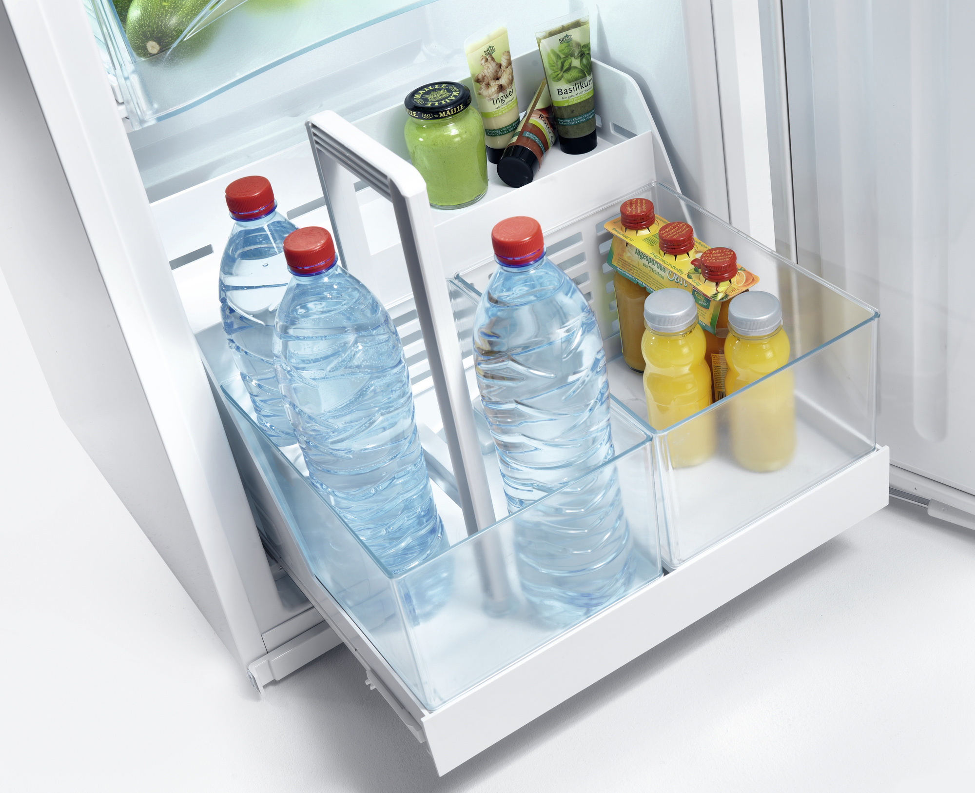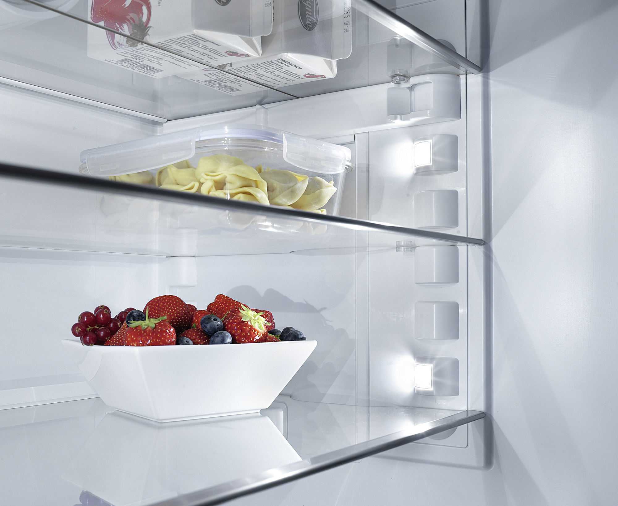 Mit einer Push-Push Bedienung lässt sich die Luftfeuchtigkeit in drei Stufen regeln, symbolisiert durch ein, zwei oder drei Tropfen: Bei drei Tropfen ist die Schublade komplett geschlossen und bietet sich für Obst und Gemüse an, das ein besonders hohes Mass an Feuchtigkeit benötigt. Neu bei den K 30.000 Kühlgeräten in Schweizer-Norm ist das Lichtkonzept „PlentyLight“. Je nach Modell sorgen drei bis sechs Lichtquellen, die alternierend auf den Tablarablageflächen angebracht sind, für die optimale Ausleuchtung des gesamten Innenraums. Auch die einteilige Gemüseschublade wird bei einigen Modellen linksseitig mit einer LED-Lichtquelle optimal beleuchtet.