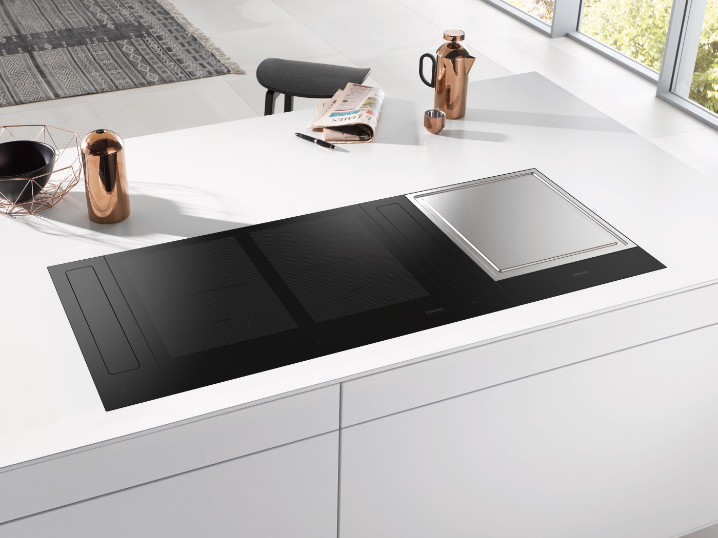 Induktionskochfeld mit einer PowerFlex-Kochzone und Teppan Yaki, dazwischen ein Tischlüfter, der den Dunst nach unten absaugt. Die SmartLine-Geräteserie von Miele erlaubt auf sehr stilvolle Weise die Zusammenstellung eines Kochzentrums nach individuellen Vorlieben. (Foto: Miele) |