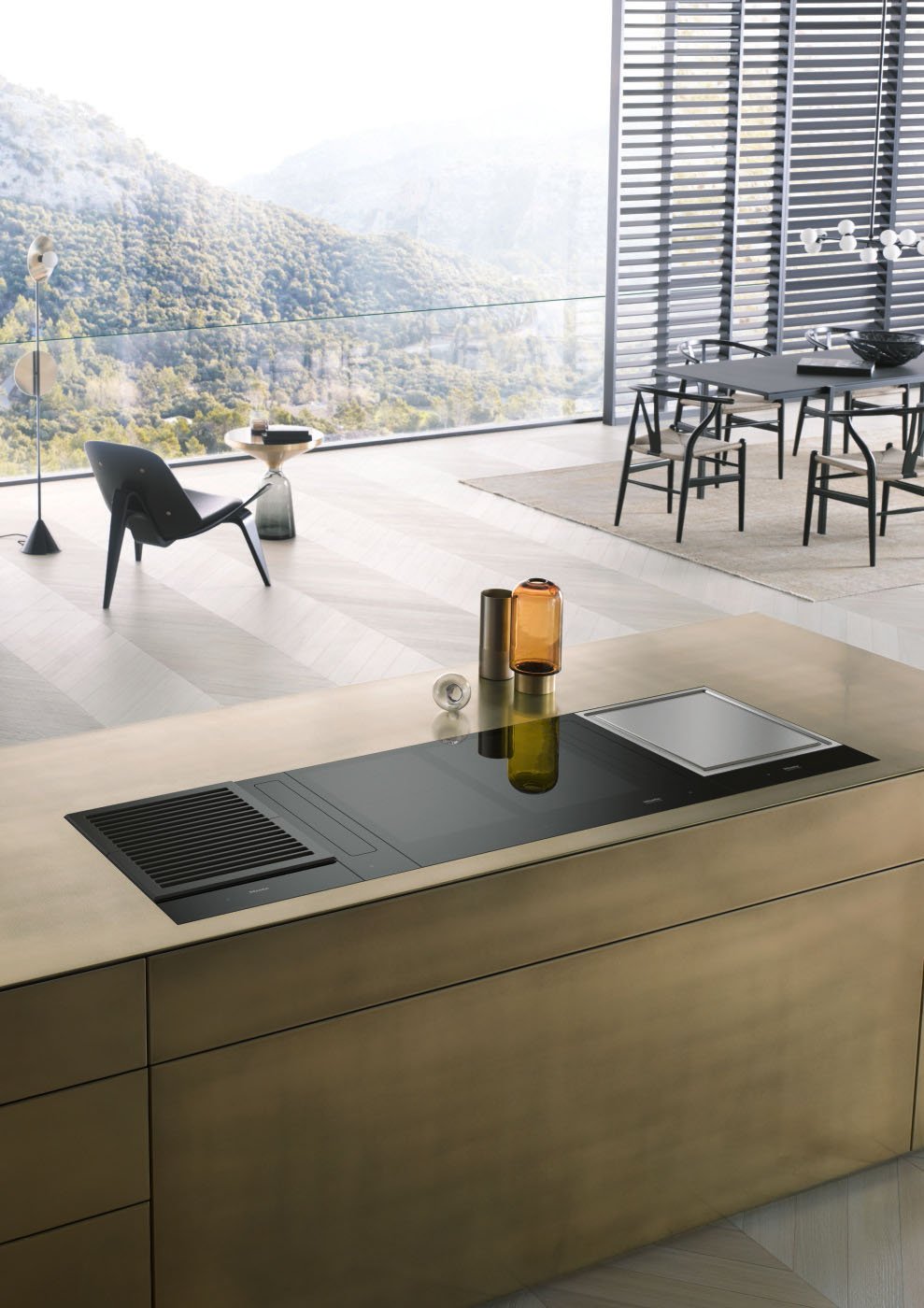 Unverwechselbares Design mit SmartLine-Kochelementen von Miele: Zwei Tischlüfter rahmen das 60 Zentimeter breite PowerFlex- Induktionskochfeld ein, rechts daneben die Teppan Yaki-Edelstahlgrillfläche. |