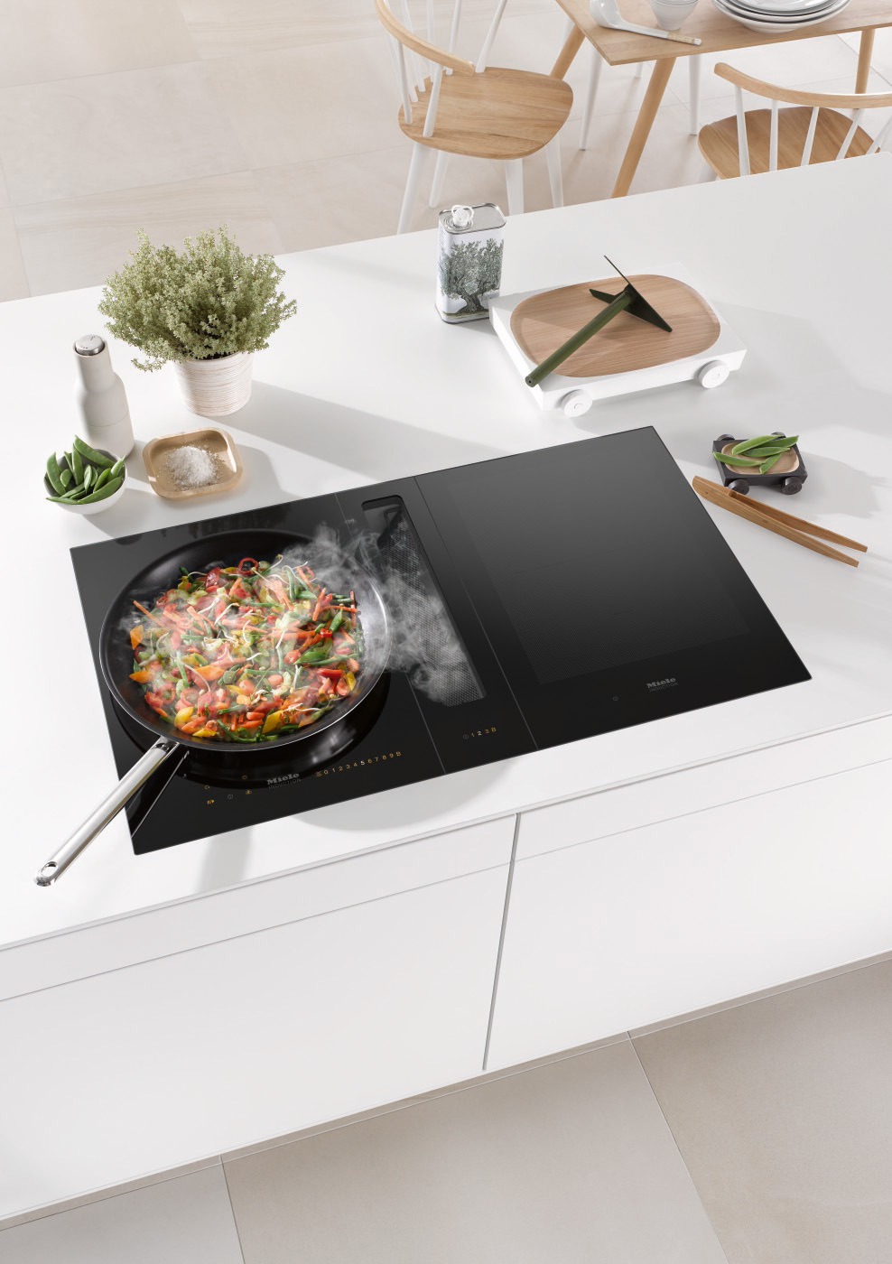 Für Freunde der asiatischen Küche: Induktionswok, Tischlüfter und PowerFlex-Induktionskochfeld von Miele aus der SmartLine-Geräteserie. Der Tischlüfter saugt die Kochdünste nach unten ab und macht eine herkömmliche Dunstabzugshaube überflüssig. (Foto: Miele) |