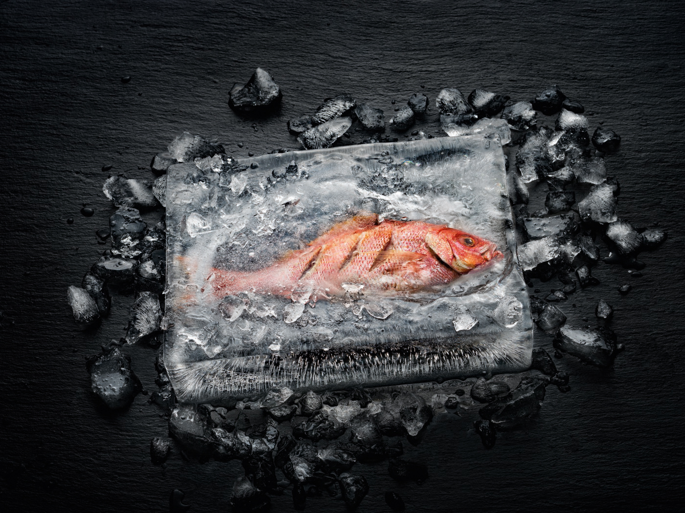 Effektvoll und exemplarisch für die revolutionären Zubereitungsmöglichkeiten des Dialoggarers ist der Fisch im Eisblock: Der Fisch ist im Eis gegart, ohne dass der umgebende Eismantel geschmolzen wäre. (Foto: Miele) |