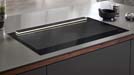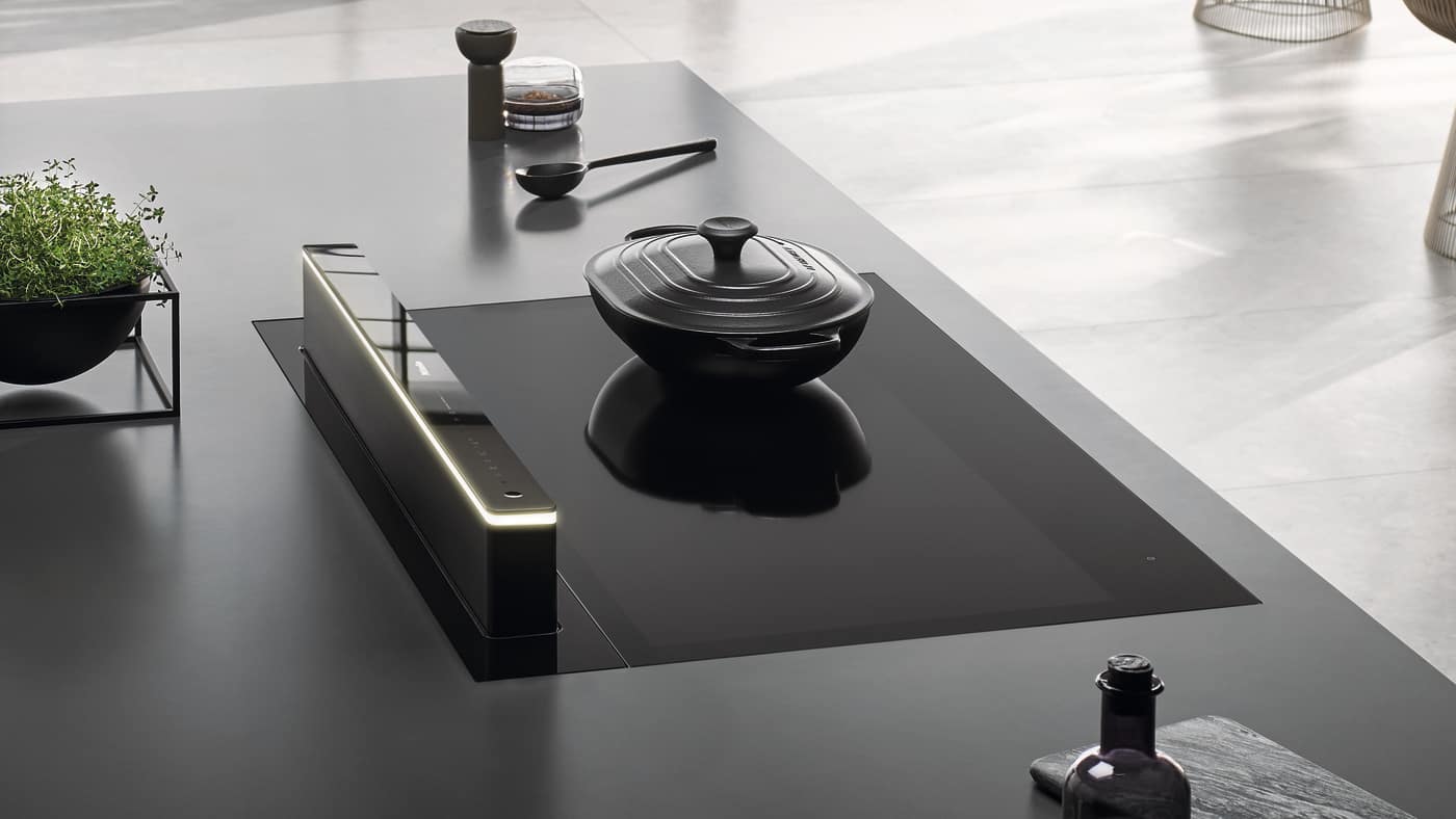 Ein Fingertipp auf die sanfte Mulde im schwarzen Glaspaneel genügt und der Wrasenschirm fährt leise hinter dem Kochfeld in seine Arbeitsposition. Im Unterschrank verbirgt sich kraftvolle und zugleich energieeffiziente Lüftungstechnik für die Absaugung von Kochdünsten und Gerüchen. Für zusätzlichen Komfort sorgt die bewährte Funktion Con@ctivity: Dunstabzug und Kochfeld kommunizieren miteinander und passen die Absaugleistung stets automatisch dem Kochgeschehen an. So kann man sich entspannt dem Kochen widmen. Zukünftig besteht die Möglichkeit, die Haube direkt über ein kleines Bedienfeld auf dem Kochfeld zu steuern – ohne Griff über heisse Töpfe.