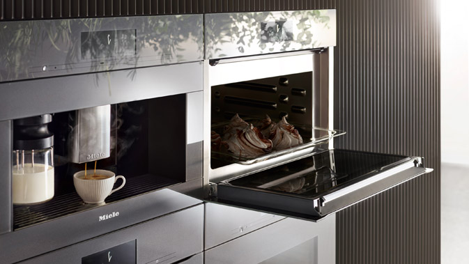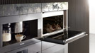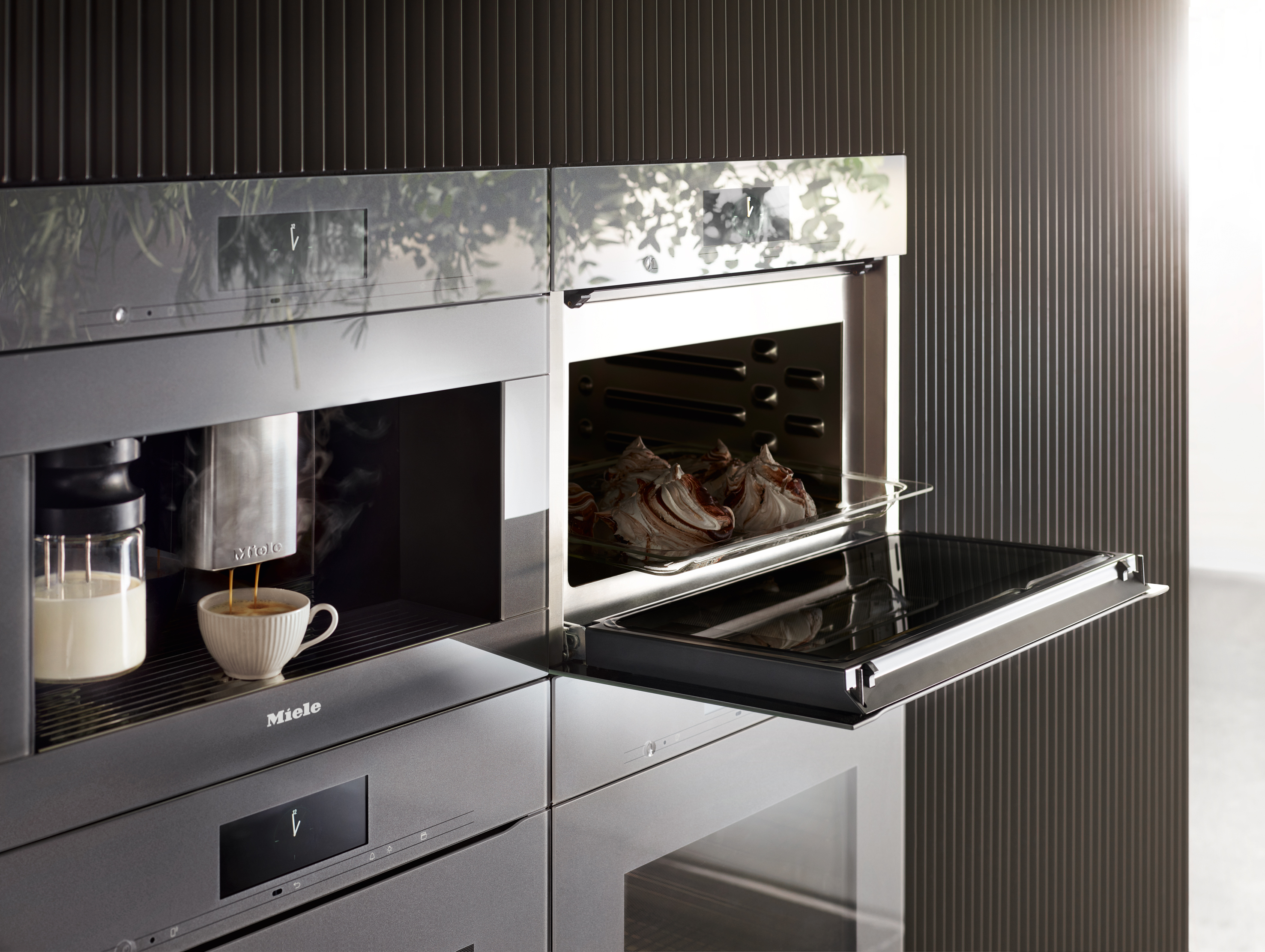 Feinster Kaffeegenuss auf unvergleichliche Weise zubereitet: Das Miele-Spitzenmodell CVA 7845, hier neben einem Kompakt-Backofen mit integrierter Mikrowelle, hat gleich drei Bohnenbehälter an Bord und beherrscht bis zu 25 verschiedene Getränkespezialitäten. (Foto: Miele)