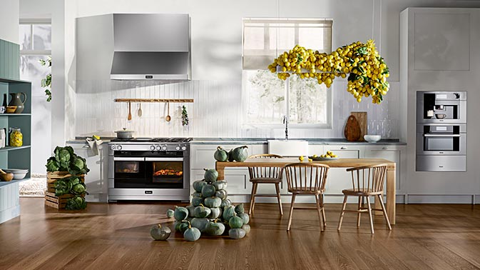 Speziell für Nordamerika entwickelt und bald auch dort produziert: Die grossen Standherde von Miele («Range Cooker», im Bild links) kombinieren amerikanisches Lebensgefühl mit der Highend-Gerätetechnologie von Miele. Zwischen 30 und 48 Zoll breit, bieten sie je nach Modell bis zu sechs Kochstellen plus Edelstahlgrill («Griddle»), zwei Backöfen (davon einer mit Mikrowelle) sowie eine Wärmeschublade. (Foto: Miele) |