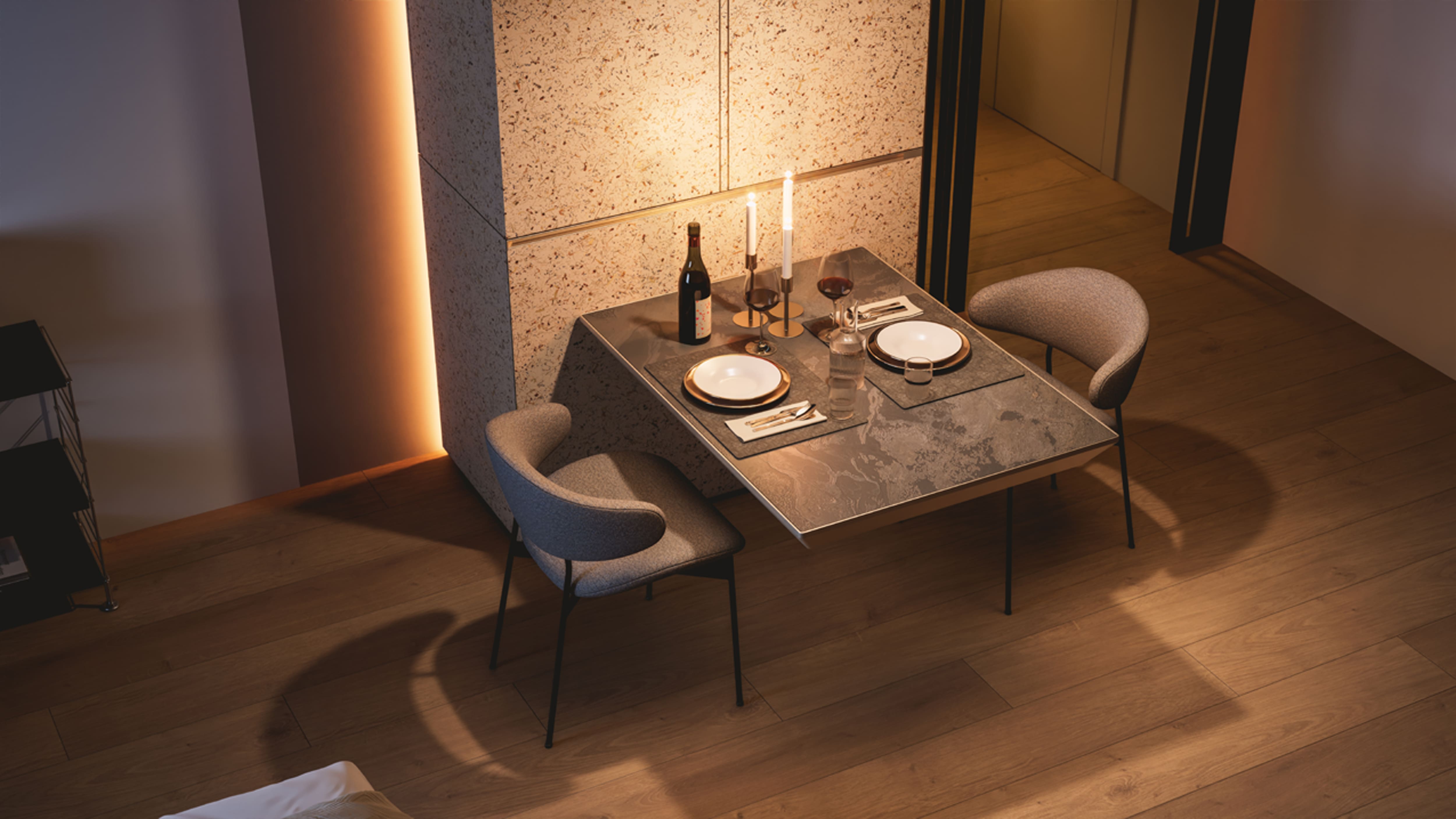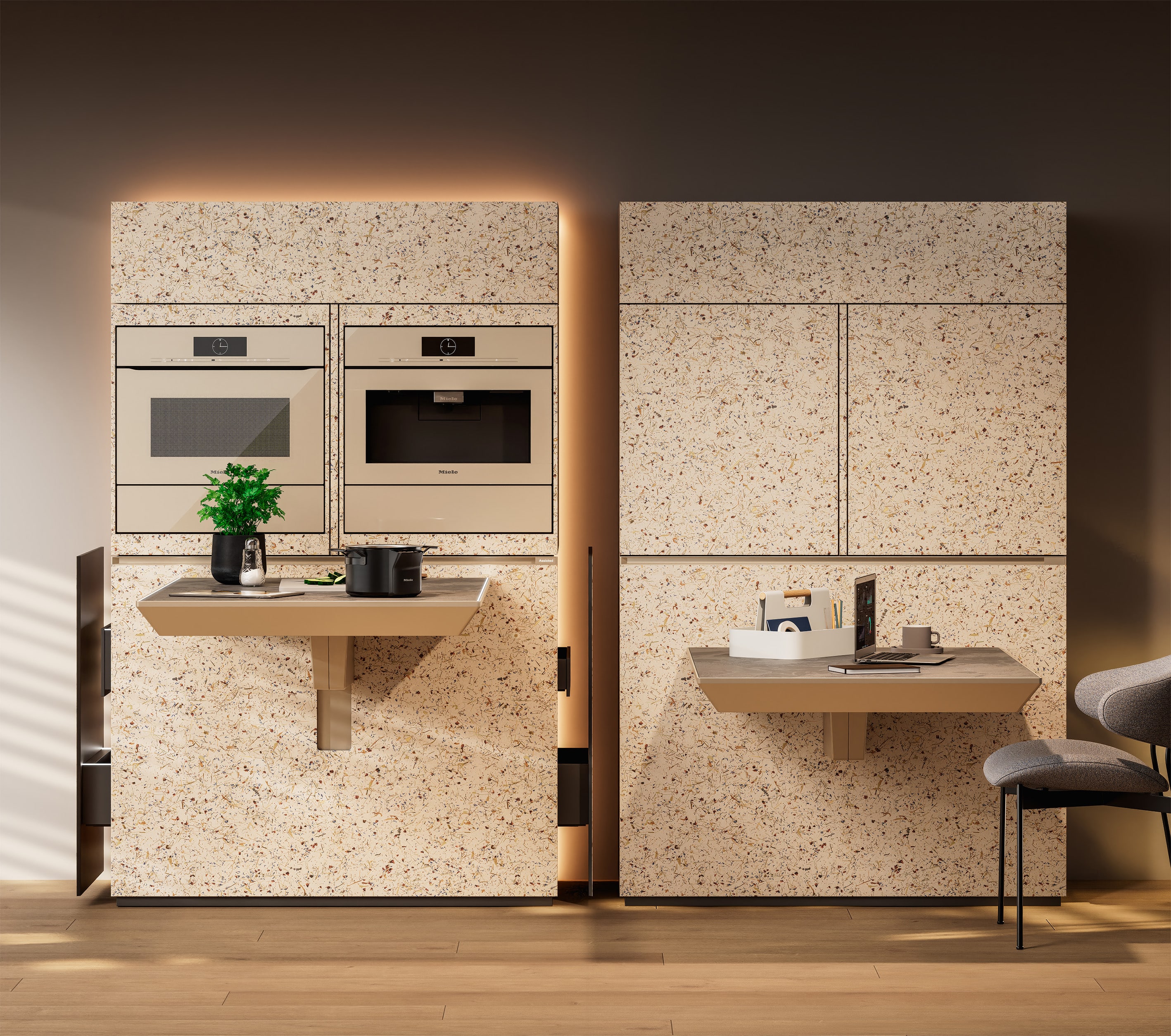 Aus dem Wandel hin zu verdichtetem urbanem Wohnen ergeben sich neue Anforderungen an Möbel, Hausgeräte und vernetzte Haushaltsprozesse. Im Rahmen von «Universal Home», einem Zusammenschluss technologisch führender Unternehmen und internationaler Dienstleister, entstehen Konzepte für neue Wohnformen. Miele und Hettich greifen einen dieser Ansätze auf und setzen ihn als Ausstellungskonzept um – mit Kücheneinbaugeräten und motorisierten Möbelbeschlägen. «Das Konzept ist aus der Frage entstanden, wie wir unsere Kompetenz in Küchengeräten und Kochprozessen in die Realität verdichteter Städte übersetzen können. Wir verstehen unsere Rolle dabei nicht nur als Gerätehersteller, sondern als Mitgestalter zukünftiger Wohnformen», so Janina Forberger, Vice President Design bei Miele.