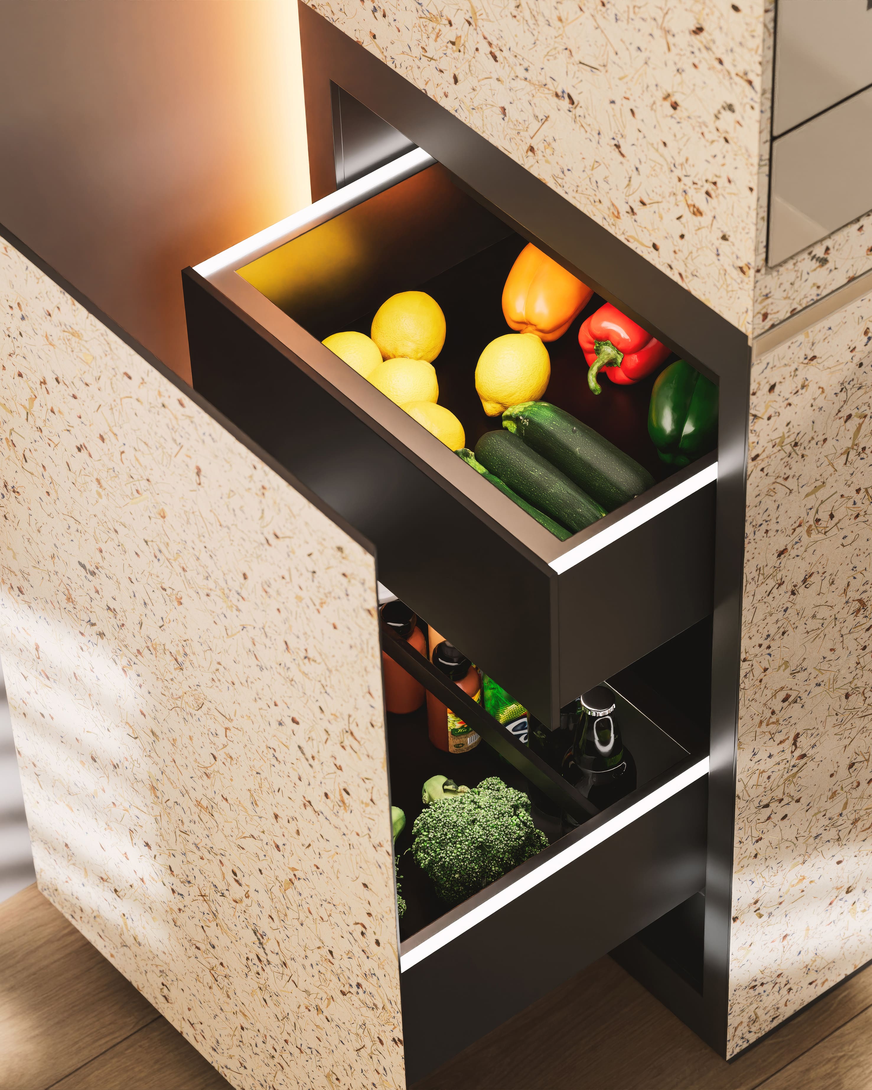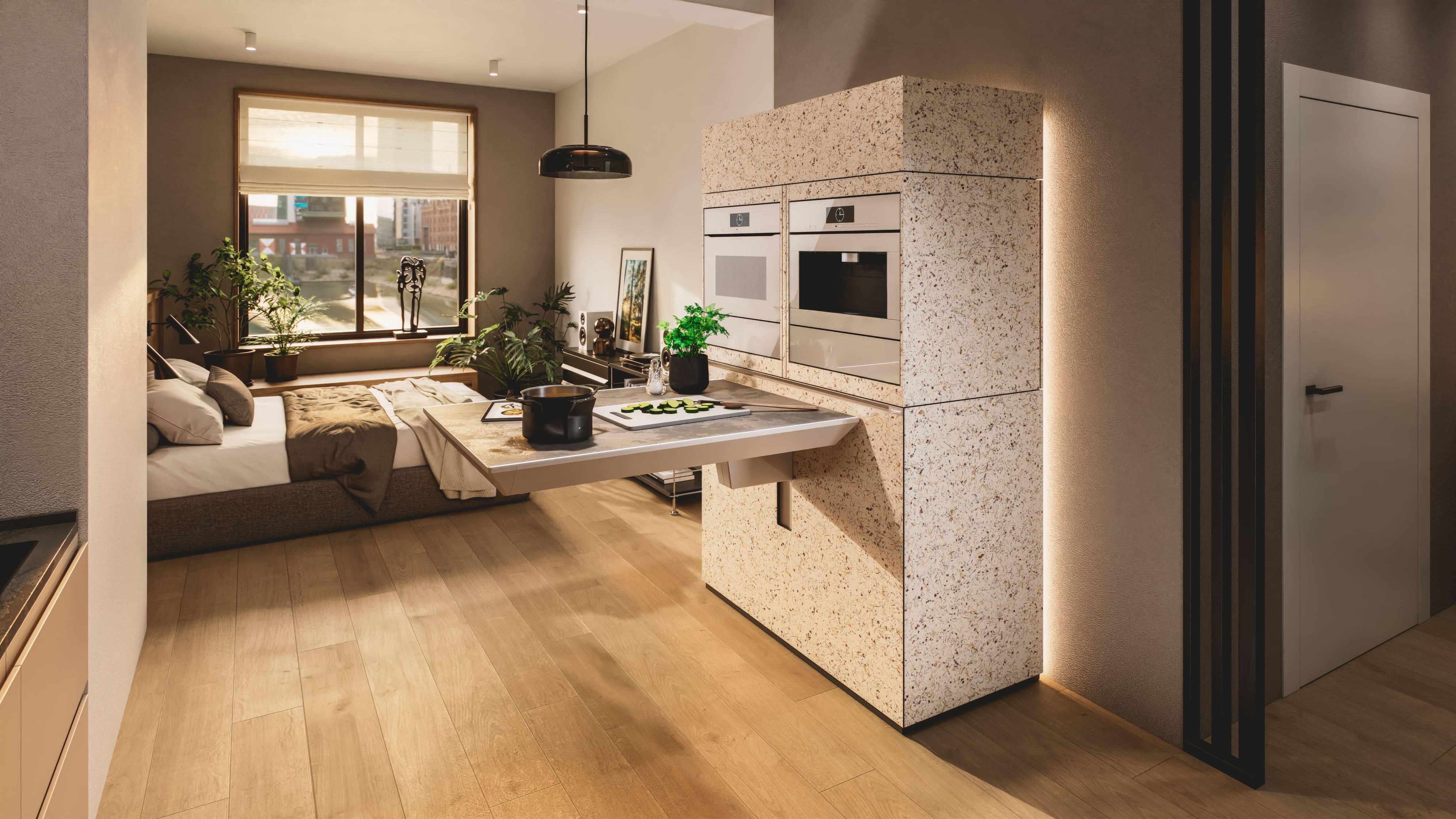 Im Zentrum stehen modulare und flexible Kochmöbel, die mehr sind als eine Küche. Sie sind Kochstation, Esstisch und Arbeitsplatz zugleich. Die Idee dahinter ist einfach: statt Räume zu trennen, greifen Funktionen ineinander – und passen sich durch flexible und verstellbare Elemente dem Alltag und nicht dem Grundriss an. Morgens Arbeitsplatz, mittags Kochfläche, abends Treffpunkt: Das Möbelstück lässt sich je nach Situation anders nutzen.