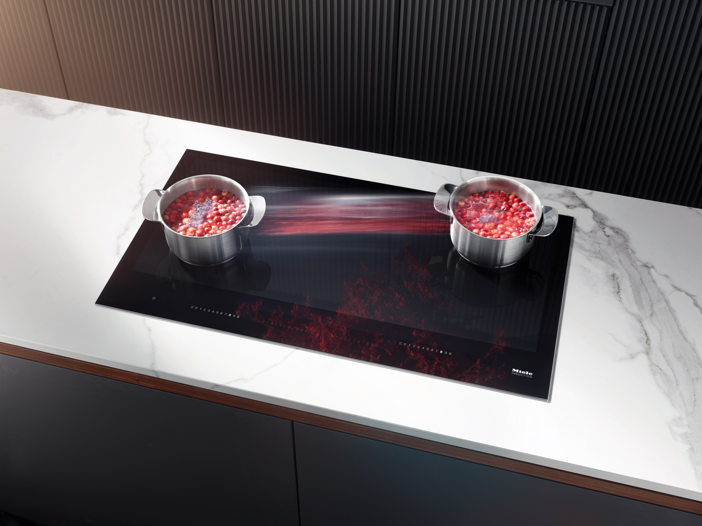 Wer nach mehr Intuition und Flexibilität beim Kochen sucht, für den ist bei Kochfeldern die Vollflächeninduktion das Nonplusultra. Das innovative Design der Miele KM 7897 FL hat auch die Jury des Red Dot überzeugt. Auf 90 Zentimeter Breite lassen sich bis zu sechs Töpfe oder Pfannen beliebig auf der gesamten Fläche positionieren und bei Bedarf auch verrücken. So passt sich die Miele-Vollfläche der Köchin oder dem Koch an und nicht umgekehrt. Ebenso komfortabel ist die Bedienung mit der SmartSelect-Steuerung: Welche Leistungseinstellung für welchen Topf gilt, ist auf einen Blick ersichtlich, denn der Zahlenstrang wandert mit, wenn das Kochgeschirr verschoben wird. Diese intelligente Topferkennung hat Miele zum Patent angemeldet. Durch das Feature SilentMove lassen sich Töpfe und Pfannen besonders leise verschieben. Denn die flächige Bedruckung des Kochbereichs befindet sich auf der Unterseite, anstatt wie sonst üblich auf der Oberseite. Voraussetzung ist die Verwendung einer hochwertigen transparenten Glaskeramik, die ihrerseits den reduziert-eleganten Auftritt unterstützt.