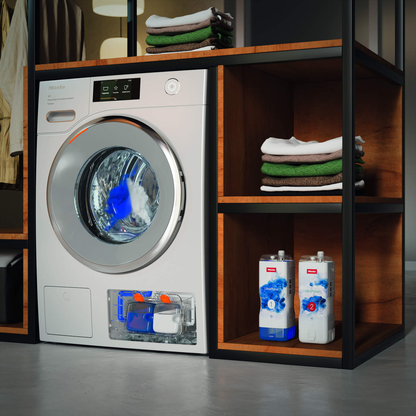Einen deutlichen Beitrag zur effizienten Nutzung des Waschmittels leistet die automatische Flüssigwaschmittel-Dosierung TwinDos, die im Gerät integriert ist. Mit TwinDos lassen sich bis zu 30 Prozent* Waschmittel sparen, was vom renommierten Öko-Institut e. V. in Freiburg unabhängig bestätigt wurde. Beim weltweit einzigen Dosiersystem für Zwei-Phasen-Flüssigwaschmittel beseitigt das Miele-Waschmittel UltraPhase 1 Verschmutzungen wie Fett und Eiweiss, ehe UltraPhase 2 hartnäckige Flecken wie Gras, Rotwein oder Kaffee entfernt. In welcher Dosierung beides zum Einsatz kommt, hängt von der Art der Wäsche und der Beladungsmenge ab. TwinDos dosiert zum passenden Zeitpunkt und im richtigen Verhältnis automatisch: Eine Über- oder Unterdosierung sowie auch das Hantieren mit dem Waschmittel gehören damit der Vergangenheit an – für maximalen Komfort und Waschen auf Knopfdruck.