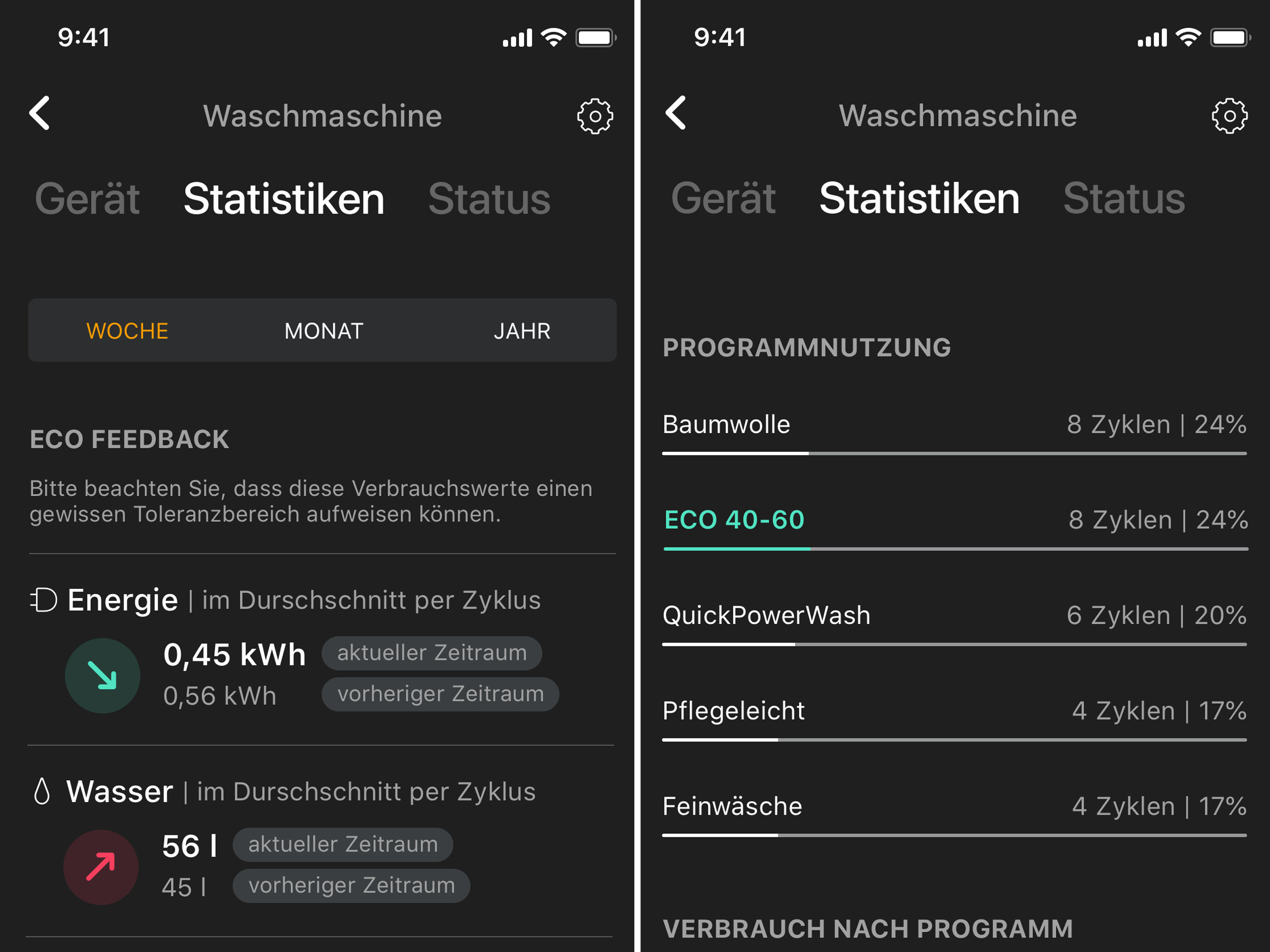 Volle Transparenz zum Energieverbrauch beim Waschen und Tipps, wie Kundinnen und Kunden ihre Geräte noch nachhaltiger und effizienter betreiben können – das bietet das neue Consumption Dashboard**, das für vernetzte Waschmaschinen ab 2023 in der Miele App verfügbar sein wird. Konkret informiert das Dashboard etwa über den tatsächlichen Wasser- und Stromverbrauch des abgelaufenen Programms. Einfach und übersichtlich ist auch die weitergehende Analyse, die Durchschnittswerte aller verwendeten Programme vergleicht. So ist auf einen Blick ersichtlich, dass das Waschprogramm Eco 40-60 gegenüber dem Programm Baumwolle (40 oder 60 °C) deutlich weniger Strom benötigt. Das Consumption Dashboard informiert zudem, wie oft ein Programm jeweils pro Woche, Monat oder Jahr verwendet wurde. Darüber hinaus führt es auch die Waschzyklen auf, denn wer mit 26 statt 30 Waschgängen im Monat auskommt, schont zusätzlich Portemonnaie und Umwelt.