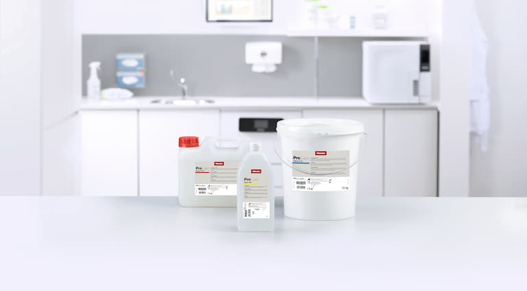 Die Prozesschemikalien stellen neben der Gerätetechnik und dem Aufbereitungsprogramm einen kritischen Faktor bei der Reinigung und Desinfektion dar. Ihre Aufgabe ist anspruchsvoll: Anschmutzungen müssen effektiv entfernt und Keime deaktiviert werden, während das Aufbereitungsgut – z. B. wertvolle Übertragungsinstrumente – weitestgehend geschont werden soll. Miele Professional stellt den Anwendern in der zahnärztlichen Praxis spezifische leistungsfähige Reinigungs-, Neutralisations- und Nachspülmittel zur Verfügung. Alle Chemikalien sind perfekt abgestimmt auf die verschiedenen Materialien und auf die Reinigungs- und Desinfektionsautomaten von Miele Professional. Aus diesem Grund wird Miele Professional von führenden Instrumentenherstellern für die Aufbereitung empfohlen.