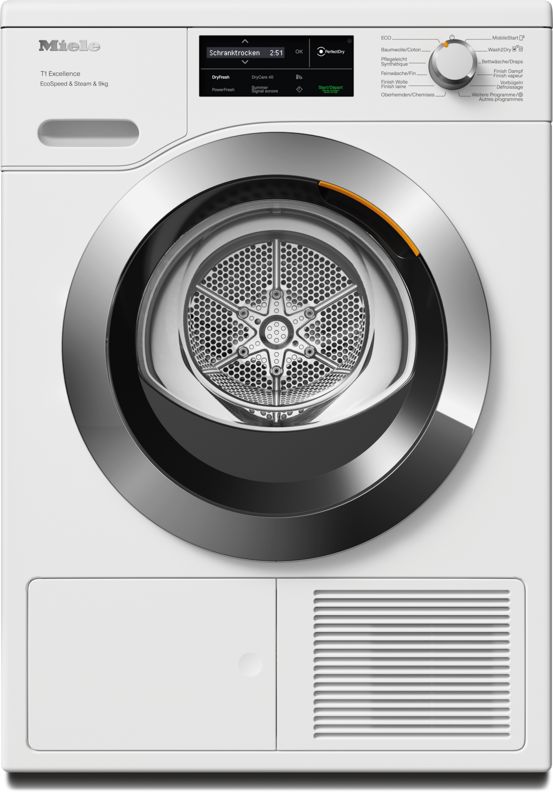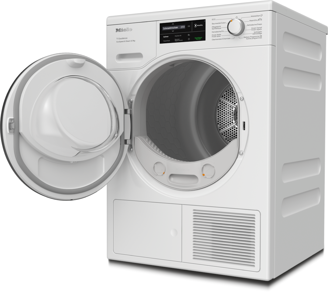 - 8.Zeitersparnis berechnet im Vergleich zu Miele Trocknern ohne EcoSpeed bei gleicher Beladungsmenge und vergleichbarer Energieeffizienz. Getestet im Programm Baumwolle bei voller Beladungsmenge.