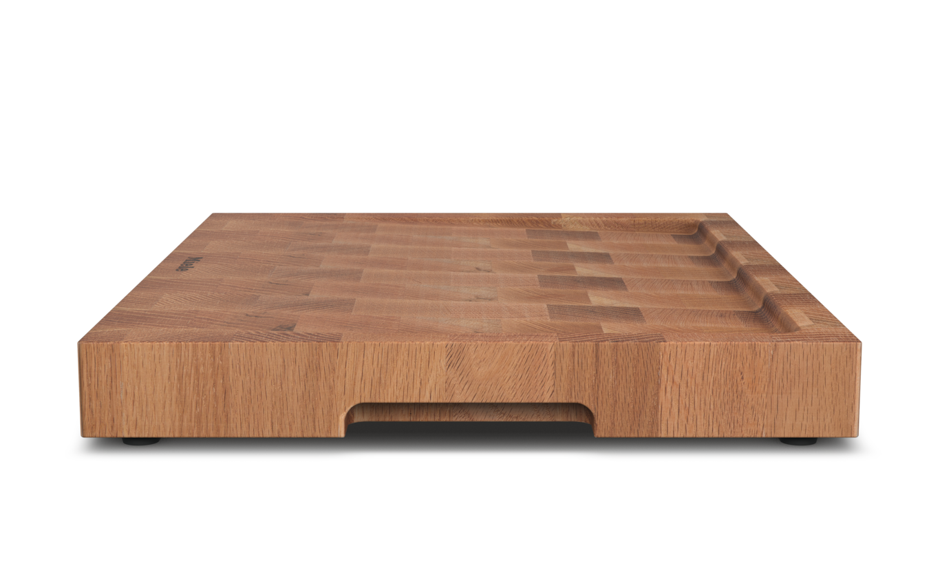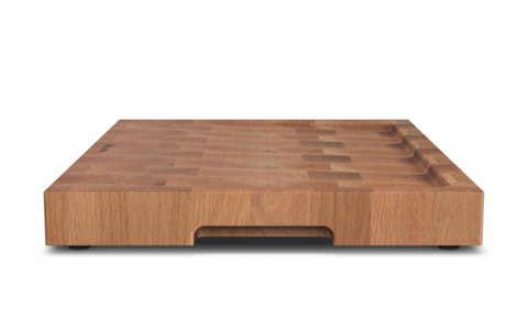 aus Eichenstirnholz mit angeschrägter Oberfläche und rutschfesten Silikonfüssen.