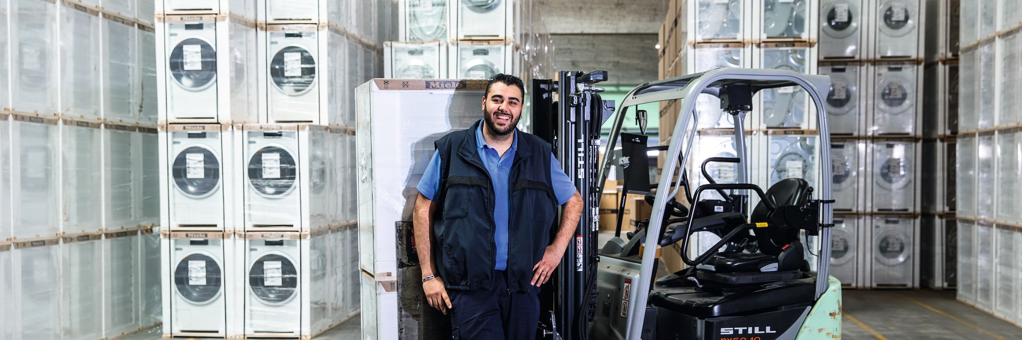 Dans notre entrepôt des machines, nous stockons et gérons nos appareils Miele de haute qualité avant qu’ils ne soient livrés à nos clientes et clients. Ton rôle est d’organiser efficacement la gestion des stocks et de veiller à ce que toutes les commandes soient traitées à temps et en parfait état. Tu t’occupes de la réception des nouvelles marchandises et tu veilles à ce que les produits soient livrés à nos clientes et à nos clients dans les délais. Tu travailles toujours avec la plus grande précision et le plus grand soin afin de garantir le bon déroulement des opérations.
