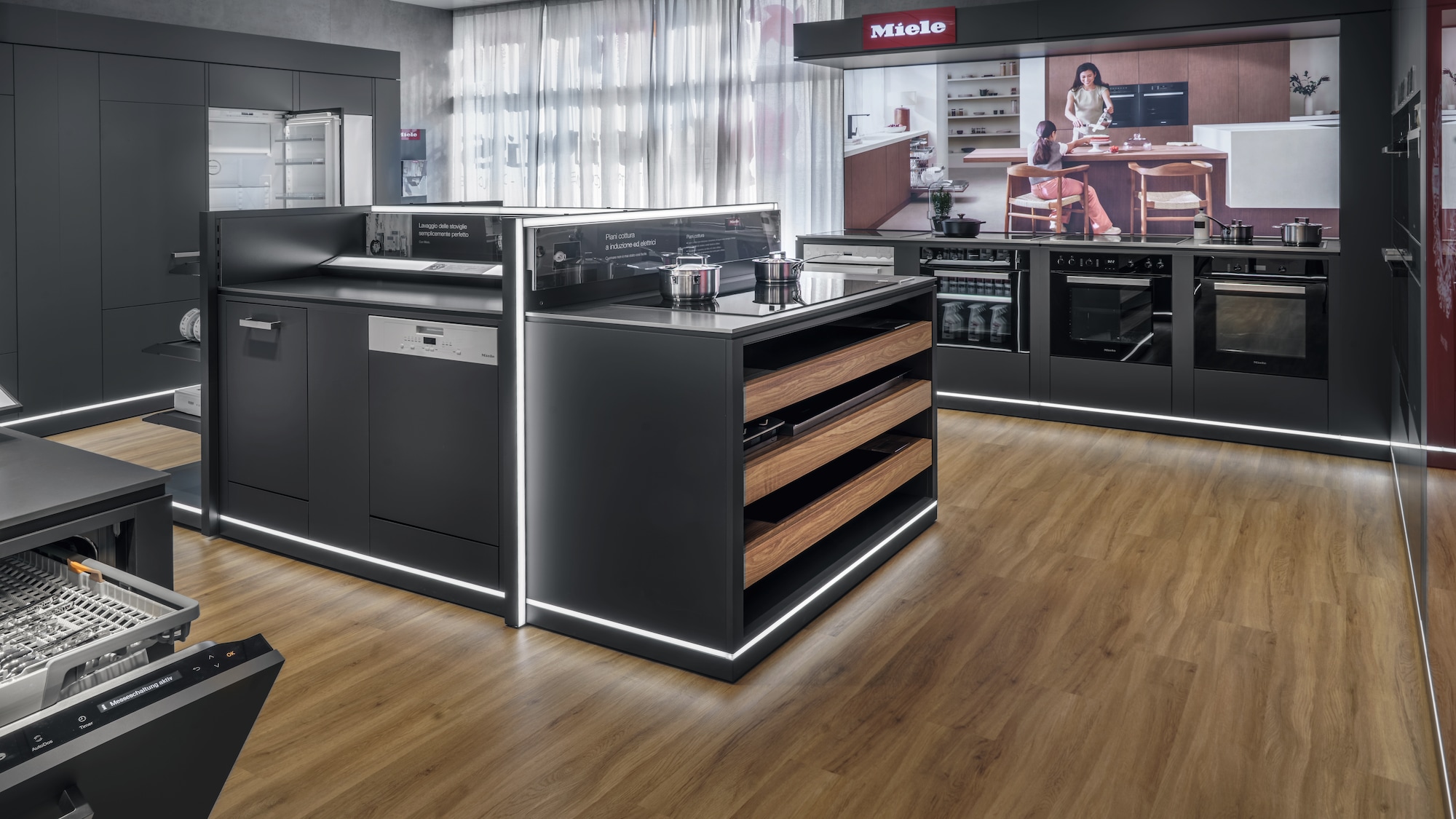 Dans notre grande exposition, vous pourrez expérimenter de près l'univers de Miele. Vous apprendrez à connaître les appareils, leurs différents éléments de commande et leurs fonctions. Vous découvrirez également les innovations qui vous seront utiles au quotidien. Comme par exemple la mise en réseau intelligente des appareils, qui vous permet de commander confortablement vos appareils via l’application Miele.
