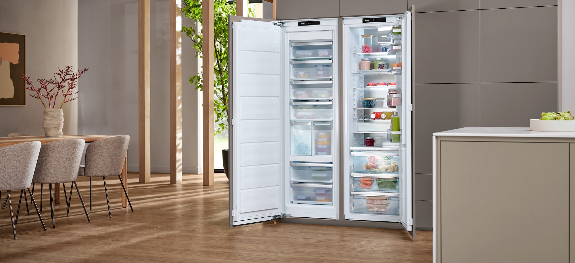 Chez Miele, vous trouverez un appareil de froid adapté à chaque besoin. Dans notre assortiment, nous proposons des réfrigérateurs et des congélateurs en tant qu’appareils individuels, mais aussi en tant que réfrigérateur-congélateur. Vous avez le choix entre des modèles à pose libre et des modèles encastrables, qui peuvent également être combinés côte à côte. Les amateurs de vin trouveront également chez nous la cave à vin parfaite avec une, deux ou trois zones de température, en tant qu’appareil à pose libre ou encastrable.
