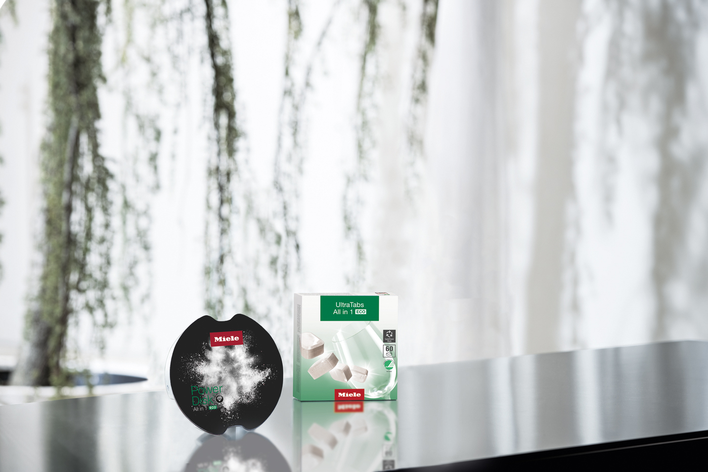Nouvelle ligne de produits “ECO” pour un lavage de la vaisselle plus respectueux de l’environnement : le PowerDisk All in 1 ECO, qui fait partie du système de dosage automatique des lave-vaisselle Miele, et les UltraTabs All in 1 ECO sont exempts de parfums, de conservateurs et de colorants, contiennent des ingrédients d’origine végétale, ont une très bonne biodégradabilité et ne contiennent pas de benzotriazole, un agent protecteur de l’argent. (Photo : Miele) |