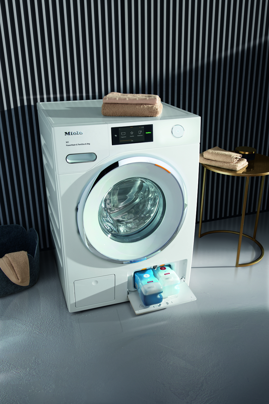 Une contribution importante à la protection contre les virus est apportée par TwinDos, un dosage breveté de lessive liquide en deux phases, disponible uniquement chez Miele. Tout d’abord, un produit de lessive de base (UltraPhase 1) élimine les salissures telles que la graisse et les protéines. Un renforçateur de lavage contenant un agent de blanchiment (UltraPhase 2) permet ensuite d’éliminer les taches plus tenaces et les germes. Les deux produits de lessive sont dosés séparément et automatiquement au bon moment et en bonne quantité en fonction du type de linge. En même temps, le procédé de lavage breveté PowerWash garantit les meilleures valeurs en termes de performance de lavage, de consommation d’énergie et d’eau ainsi que des durées de programme courtes grâce à une pompe de circulation supplémentaire et à un rythme de rotation spécial du tambour (“Spin & Spray”).
