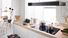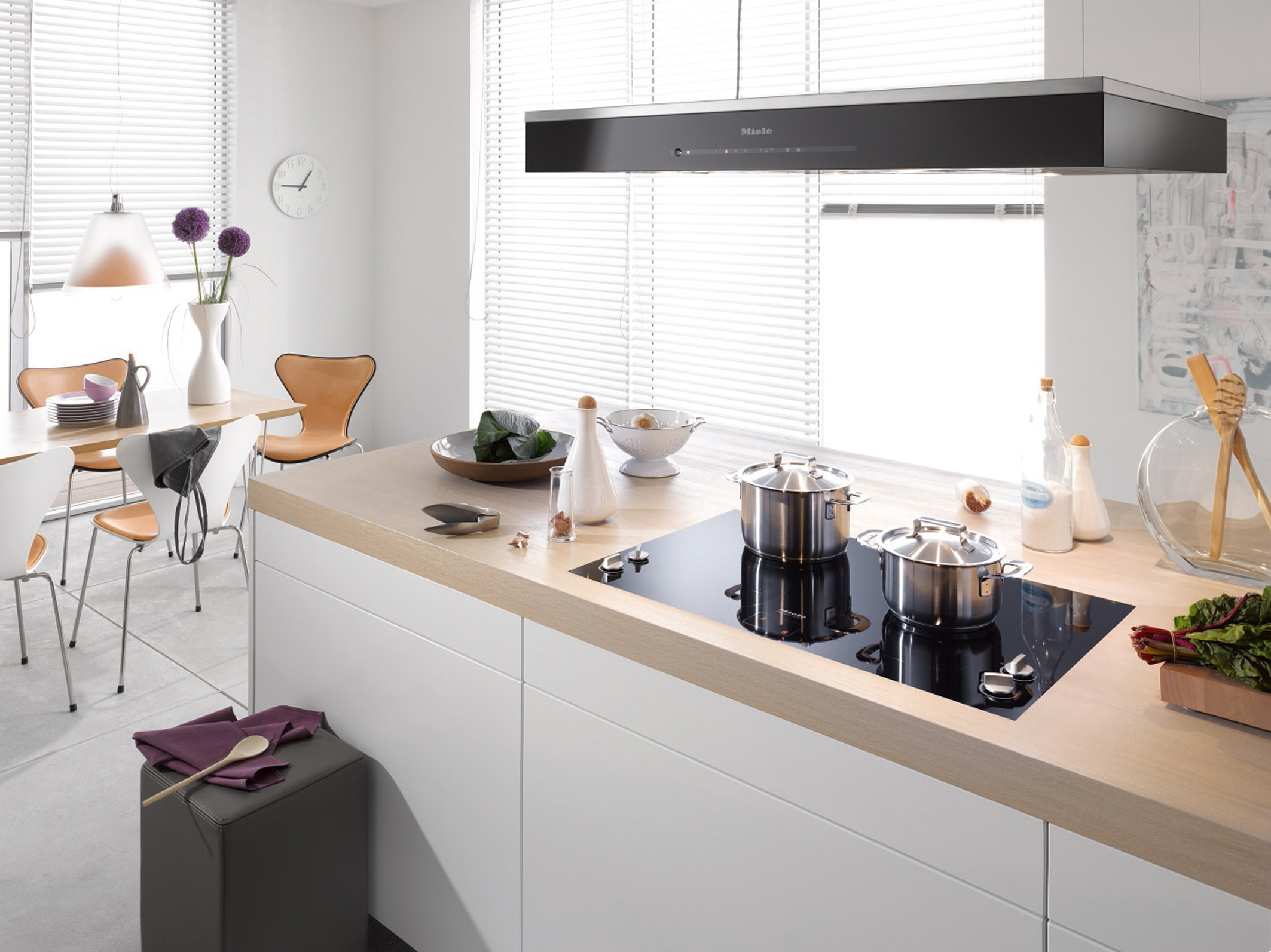 La nuova cappa aspirante a riciclo per isole di cottura è in perfetta sintonia col design degli elettrodomestici da incasso Miele.