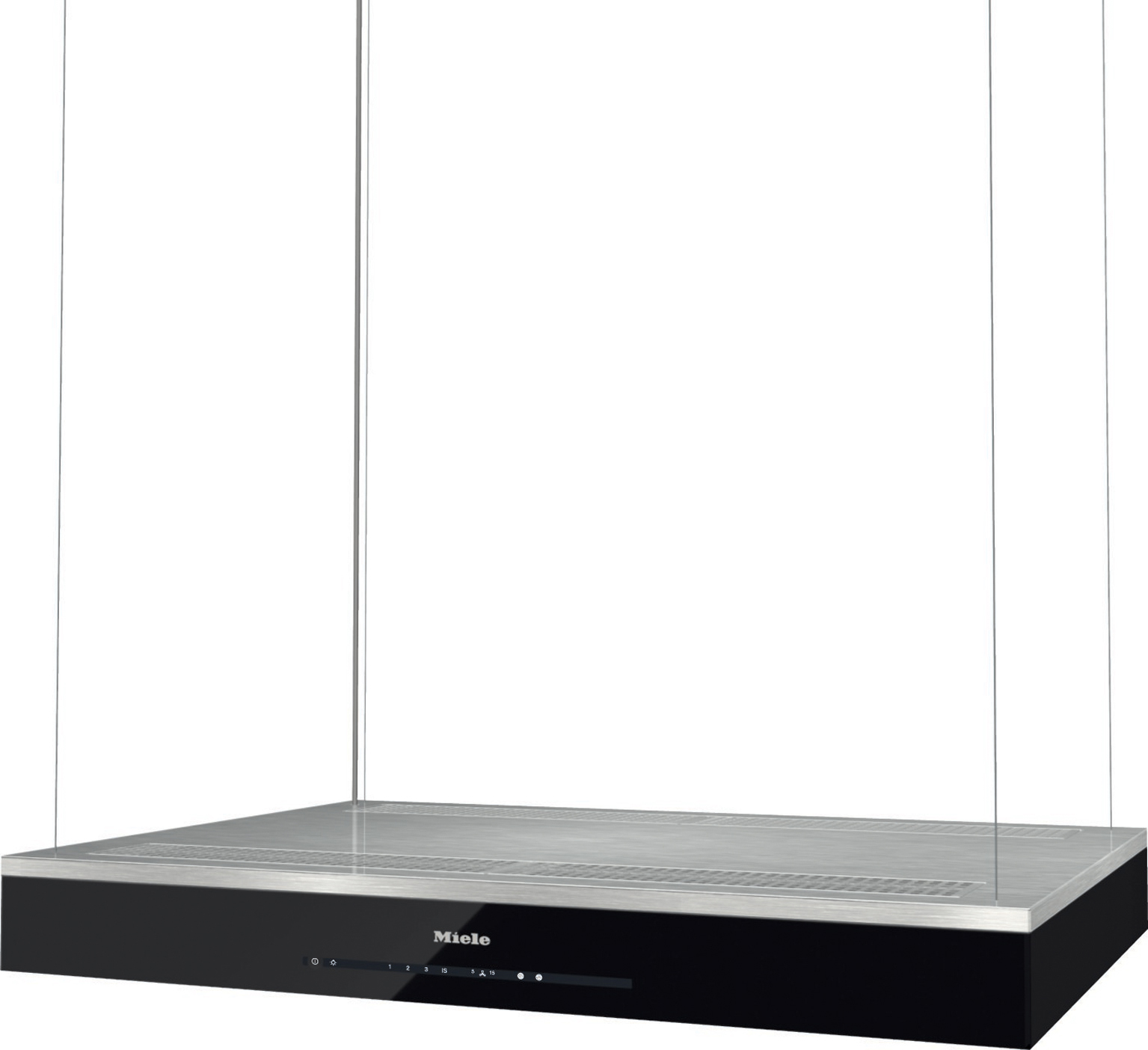 La cappa Aura Edizione 6000 (DA 6700) funziona a riciclo, quindi senza tubo di evacuazione, e rimane sospesa sopra la zona di cottura attaccata a quattro cavetti in acciaio pressoché invisibili. La superficie aspirante, larga 100 cm e ultrapiatta, conferisce a questa modello leggerezza ed eleganza. Il pannello con i tasti di comando è sistemato sotto vetro ed evidenzia palesemente l’affinità della cappa per isole di cottura con gli elettrodomestici Miele da incasso della generazione 6000. Come nel caso dei forni convenzionali, a vapore e di altri apparecchi, è possibile optare per tre versioni: in acciaio CleanSteel, bianco brillante e nero ossidiana.