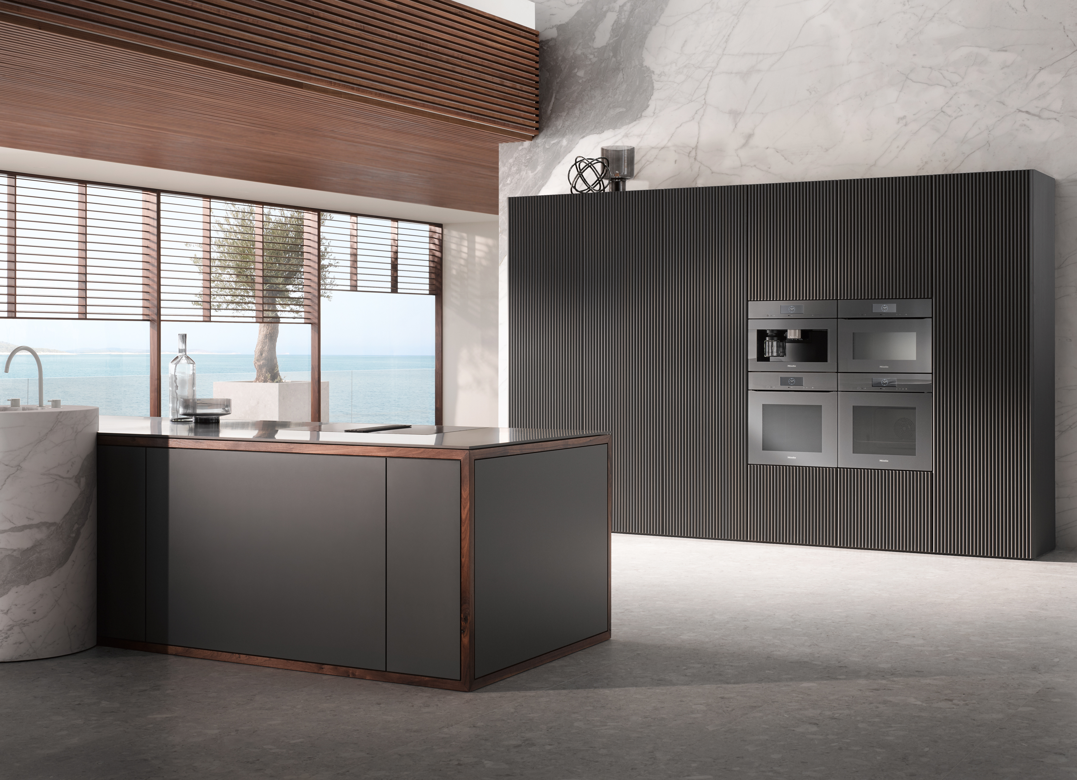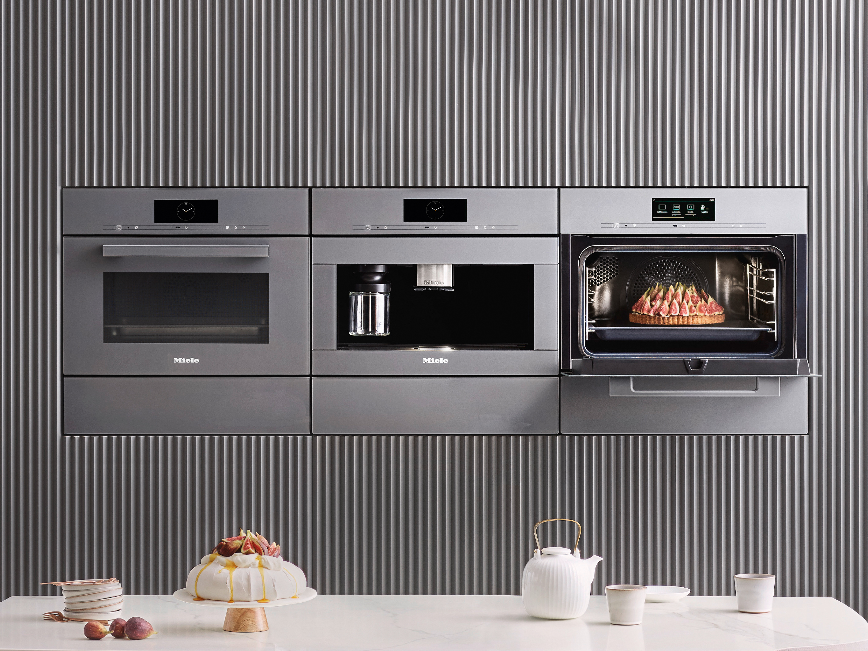 Apparecchi da incasso Miele nel design VitroLine, qui in grigio grafite: la combinazione di forno a vapore combinato, macchina da caffè, forno compatto con microonde (da sinistra) più due cassetti scaldavivande e un cassetto sottovuoto (ciascuno installato in basso) esaudisce qualsiasi desiderio. (Foto: Miele) |