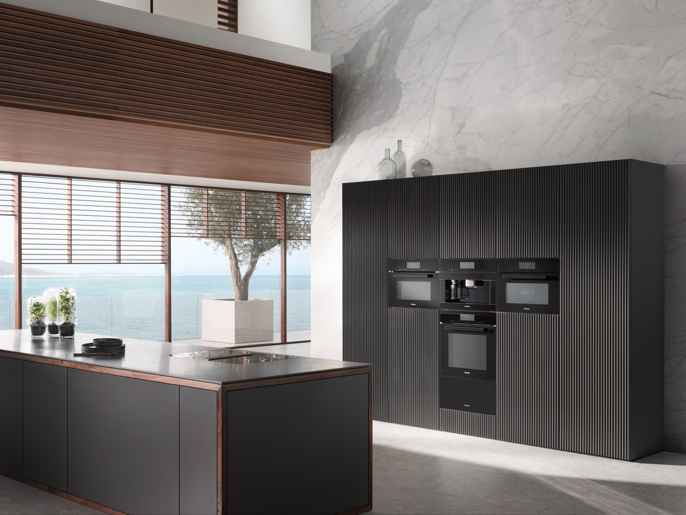 Massima essenzialità: apparecchi da incasso Miele nel design ArtLine senza maniglie, qui disposti a forma di cubo e in grigio grafite. (Foto: Miele) |