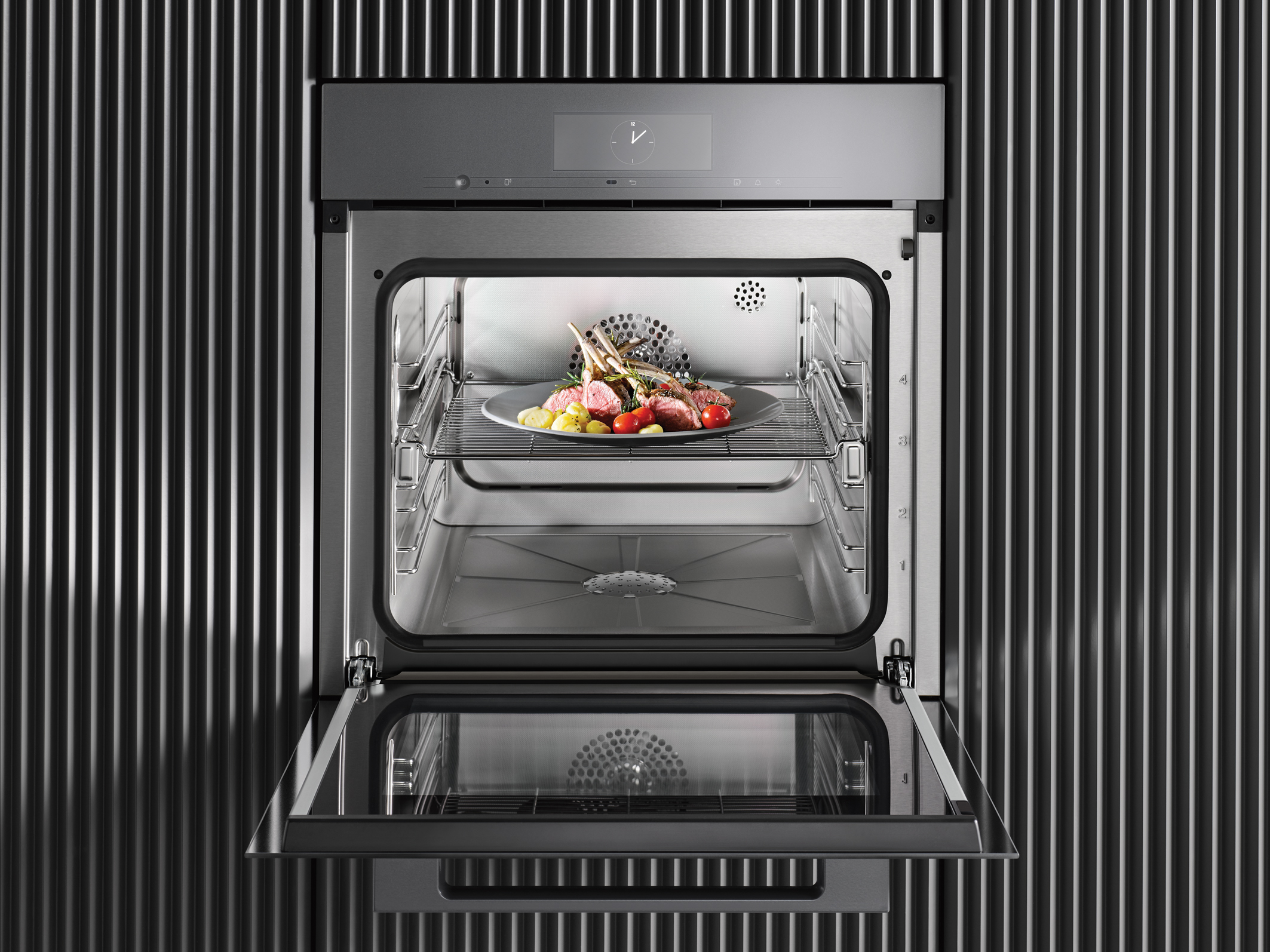 La “cottura arrosto gourmet”, invece, assicura una carne tenera e succosa: la carne viene cotta in modo particolarmente delicato e soffice, a bassa temperatura e per un lungo tempo di cottura. L'uso aggiuntivo dell'umidità contribuisce a un risultato ottimale di cottura e doratura. Si cuoce in modo uniforme e si ottiene una sottile crosticina marrone: non è necessario rosolarla prima. Tutti i modelli sono dotati del pannello di sollevamento brevettato ad apertura e chiusura motorizzata, che nasconde il serbatoio dell'acqua, il contenitore della condensa e, a seconda del modello, la sonda termometrica wireless.