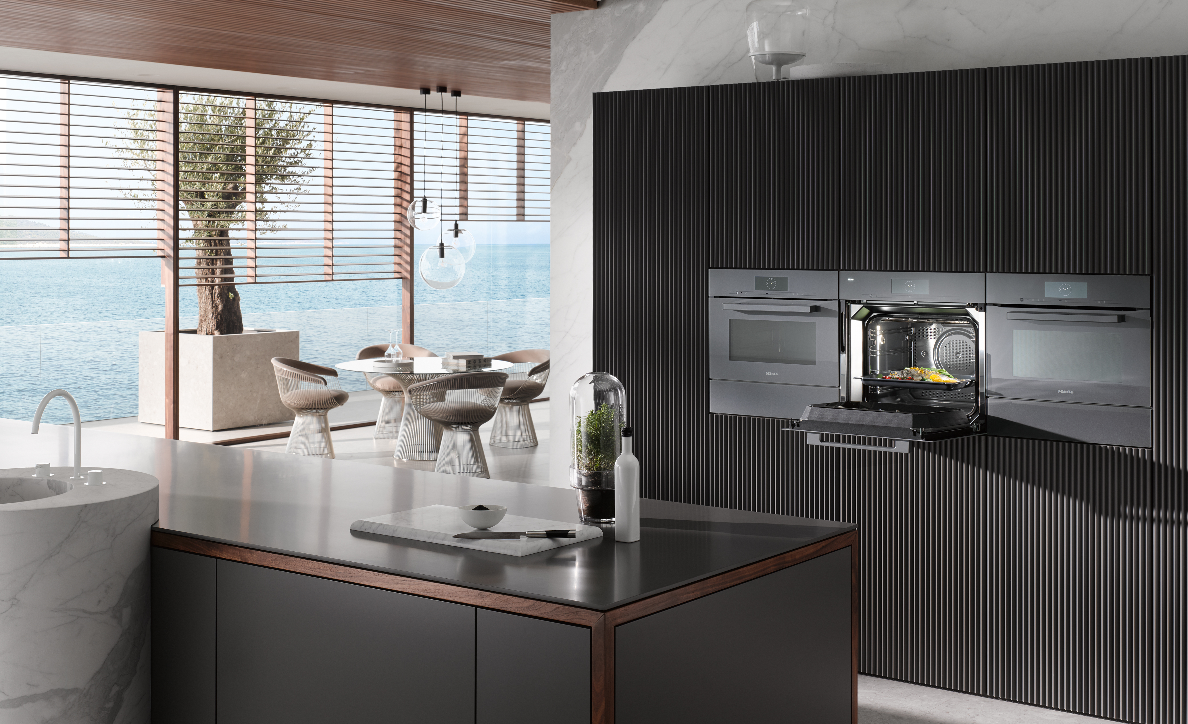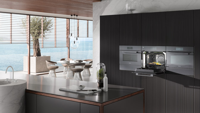 La sua tecnologia rende il forno Dialogo un apparecchio di cottura unico nel suo genere. In questa disposizione orizzontale, l'apparecchio in grigio grafite occupa lo spazio al centro. (Foto: Miele) |