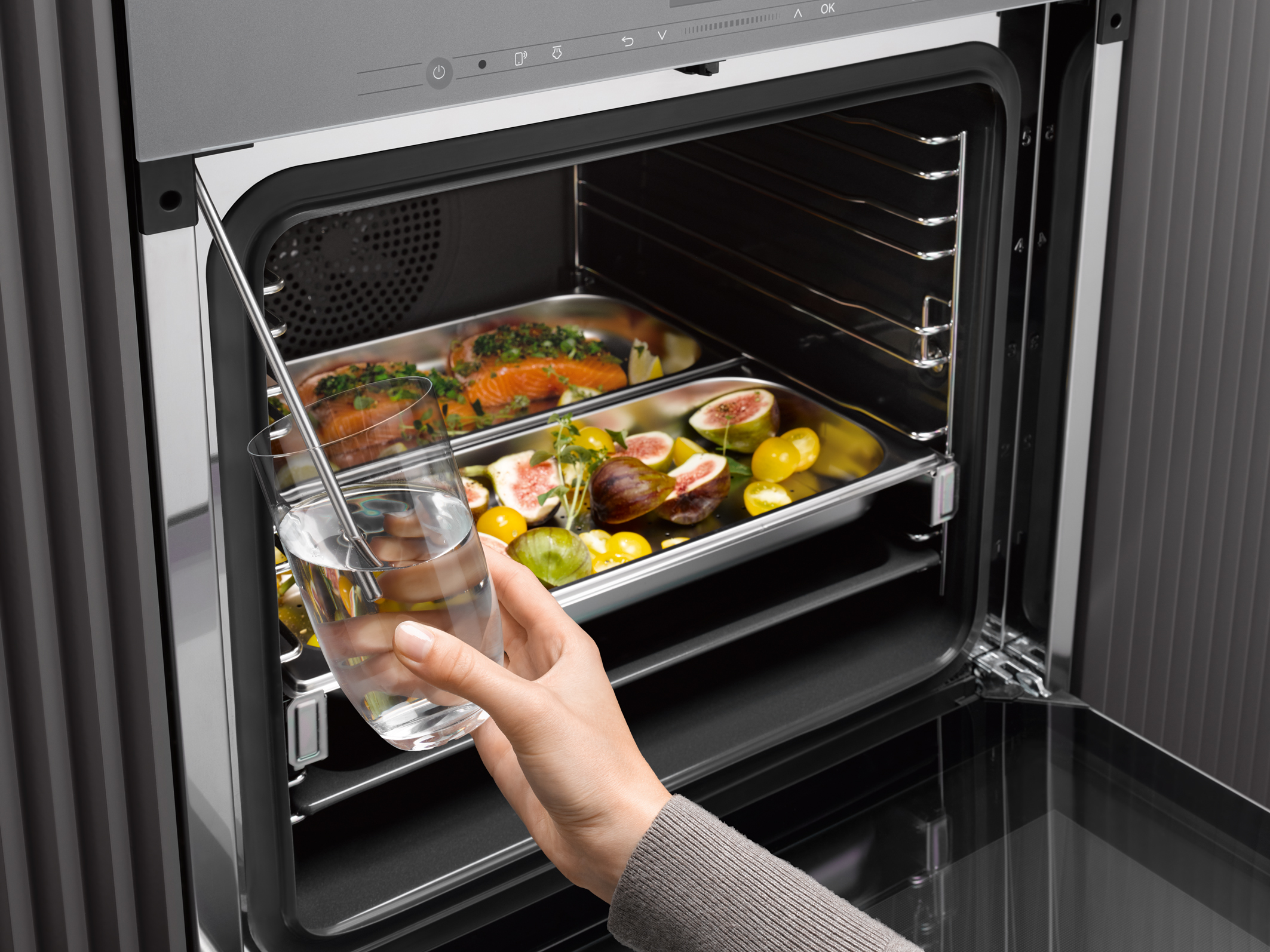 Per la cottura a vapore, un tubo in acciaio inox sul telaio dello sportello aspira l'acqua necessaria da un apposito recipiente prima della funzione di cottura. Il serbatoio così riempito può essere utilizzato per cucinare con vapore a una temperatura compresa tra 70 °C e 100 °C per un massimo di un'ora. (Foto: Miele) |