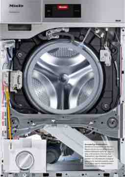 Sämtliche Komponenten der Kleinen Riesen werden aus sorgfältig ausge- wählten Materialien gefertigt. Das um- fasst unter anderem den robusten Stahlrahmen, den Edelstahl Laugen- behälter und die massiven Grauguss- gewichte für höchste Laufruhe, sowie die im Miele eigenen Elektronikwerk hergestellten Steuerungen.