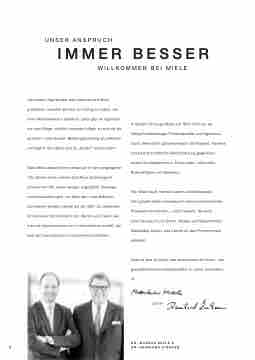 In diesem Sinne gilt Miele seit 1899 nicht nur als Inbegriff erstklassiger Produktqualität und Ingenieurs- kunst. Miele steht gleichermassen für Respekt, Fairness und partnerschaftliche Wertschätzung gegenüber seinen Vertriebspartnern, Endkunden, Lieferanten, Beschäftigten und Nachbarn.